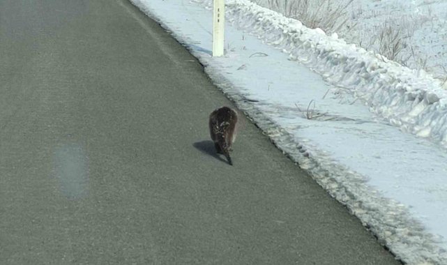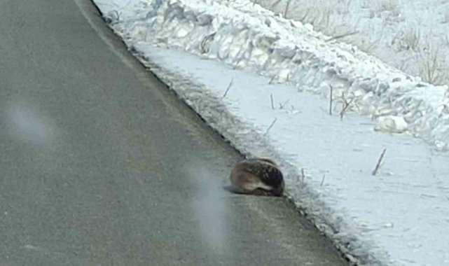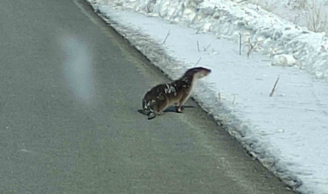 Ardahan'da yolunu kaybeden su samuru kara yolu kenarında görüntülendi.