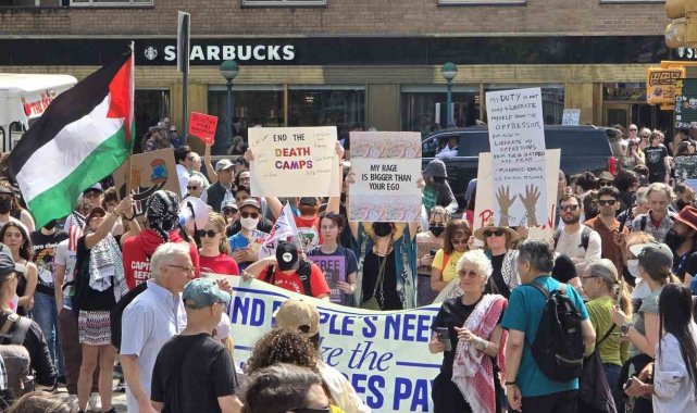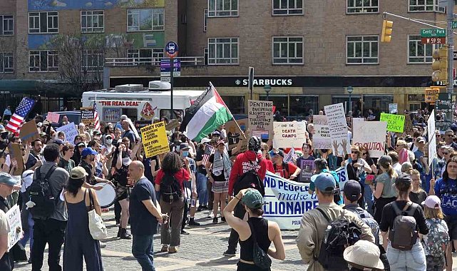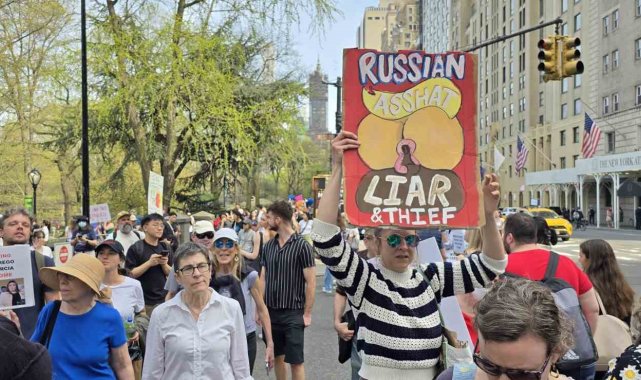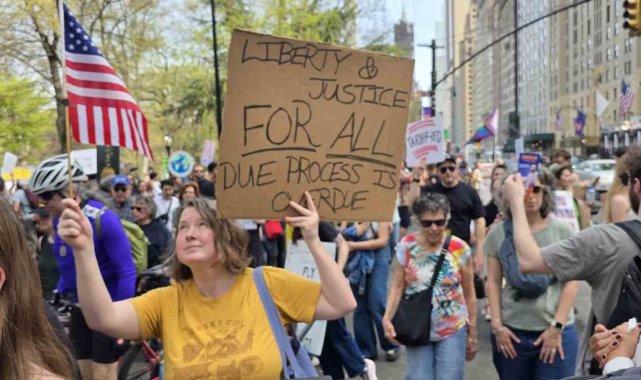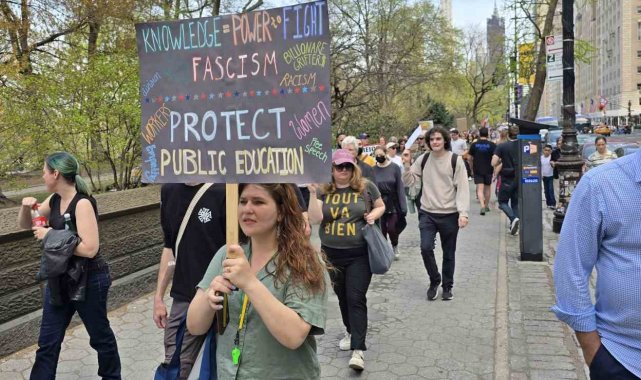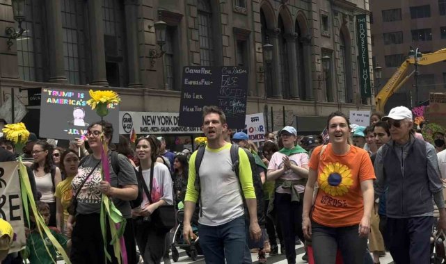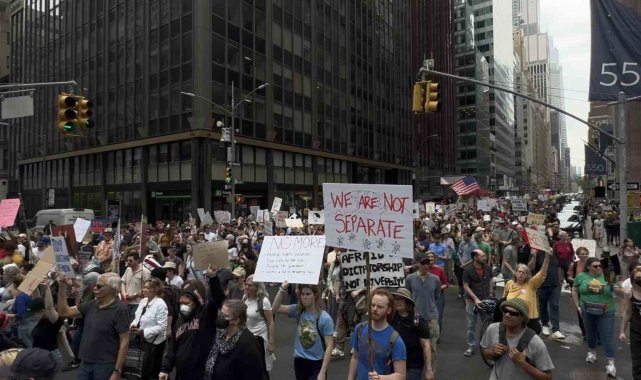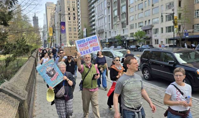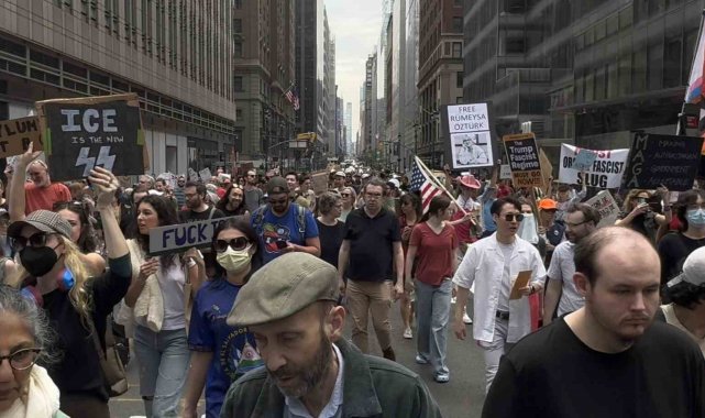 ABD'de Başkan Donald Trump ve yönetimi politikaları nedeniyle tepki görüyor. Trump ve Hükümet Verimliliği Departmanı'nın (DOGE) başındaki Elon Musk'ın göçmen politikalarına, federal çalışanların işten çıkarılmasına ve öğrencilere yönelik baskılarına tepki gösteren binlerce kişi New York şehrinde bir araya geldi. Bryant Park'tan başlayan ve Central Park Columbus Meydanı'nda sona eren protesto gösterisinde "Trump Kral Değil", "Elon Musk İstifa", "Özgür Filistin" gibi sloganlar atan binlerce kişi gözaltına alınan Mahmoud Khalil ve Rümeysa Öztürk için de özgürlük çağrısı yaptı. "Rümeysa'ya Özgürlük", "Mahmoud Khalil'e Özgürlük" yazılı pankartlar taşıyan protestocular, öğrencilerin serbest bırakılmasını istedi.