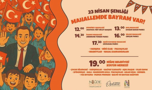 23 Nisan günü sabah saatlerinden itibaren başlayan etkinlikler kapsamında, Niğde'nin çeşitli mahallelerinde şenlik alanları kurulacak. Etkinlikler saat 12.00'de Efendibey Mahallesi'ndeki Mustafa Yiğit Millet Bahçesi'nde başlayacak. Ardından sırasıyla saat 13.00'te Nar Mahallesi Doğan Baran Parkı, 14.30'da İlhanlı Mahallesi Memnune Türker Parkı, 16.00'da Selçuk Mahallesi Selçuk Parkı ve 17.30'da Aşağı Kayabaşı Mahallesi Kızılelma Parkı şenlik alanına dönüşecek. Her mahallede kurulacak etkinlik alanlarında; çocuklar için yarışmalar, mini kulüp aktiviteleri, palyaçolar, sevimli maskotlar ve masal kahramanlarıyla dolu eğlenceli gösteriler yer alacak. Etkinlikler süresince mahalleler adeta bayram yerine dönecek. 23 Nisan kutlamalarının finali ise saat 19.00'da Niğde Belediyesi Kültür Merkezi'nde gerçekleştirilecek büyük organizasyonla yapılacak. Buradaki etkinlikler çocuklara yönelik eğlenceyi zirveye taşıyacak nitelikte. Kültür Merkezi'ndeki programda; Hacivat-Karagöz, Aşık-Maşuk ve yılan gösterisi gibi geleneksel ve modern sahne performanslarının yanı sıra, Spiderman, Nasreddin Hoca, Aslan Kral, Sümbül ve Pamuk Prenses gibi sevilen karakterler çocuklarla buluşacak. Palyaçolar eşliğinde yüz boyama etkinlikleri, oyunlar ve sürprizlerle dolu programda, bayramın coşkusu doyasıya yaşanacak.