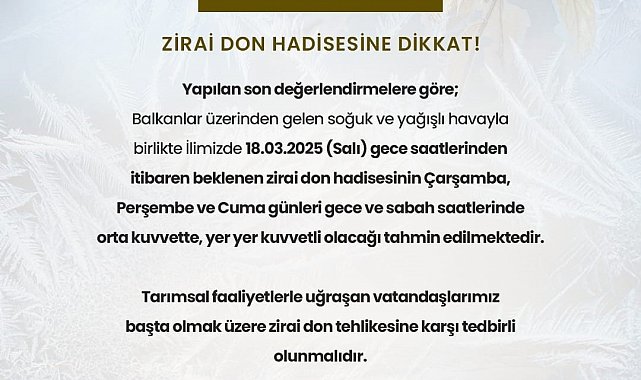 Niğde Valiliği, özellikle tarımsal faaliyetlerle uğraşan vatandaşları zirai don olayına karşı dikkatli ve tedbirli olmaları konusunda uyardı.