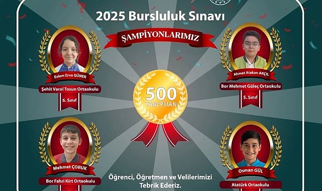 2025 yılı Bursluluk Sınavı'nda Niğde genelinden dört öğrenci büyük bir başarıya imza atarak tüm soruları doğru yanıtladı ve 500 tam puan alarak şampiyonlar arasında yerini aldı.
