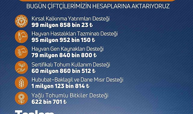 Açıklamada, destekleme ödemelerinin üreticilerin hesaplarına aktarılmaya başlandığı ifade edilerek çiftçilerin hesaplarını kontrol etmeleri istendi. Duyurulan destekleme ödemeleri kapsamında üreticilere toplam 338 milyon 258 bin liralık destek sağlanacağı bildirildi.