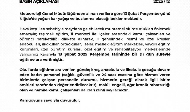 Niğde Valiliği tarafından yapılan açıklamada, buzlanma ve olumsuz hava şartları nedeniyle meydana gelebilecek muhtemel olumsuzlukları önlemek amacıyla 14 Şubat 2025 Cuma günü il genelinde eğitime 1 gün süreyle ara verildiği duyuruldu.