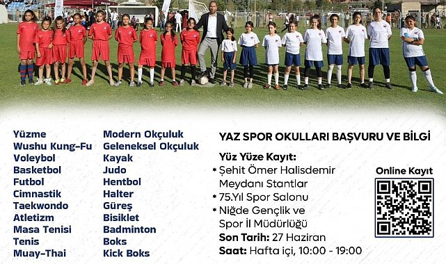 Niğde Belediyesi ile Gençlik ve Spor İl Müdürlüğü iş birliğinde düzenlenen ve geleneksel hale gelen yaz spor okulları, bu yıl da 'Ulusal Spor Projeleri: Sporla Yaşa!' sloganıyla start alıyor. Gençlerin yaz tatilini verimli, sağlıklı ve eğlenceli bir şekilde geçirmesini amaçlayan proje kapsamında, 25 farklı branşta ücretsiz spor eğitimi verilecek.
