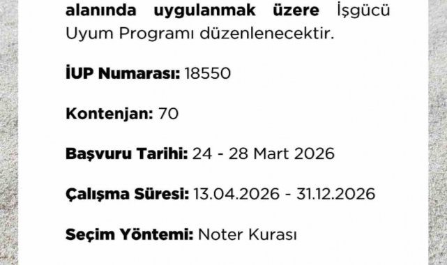 Öte yandan Niğde Ömer Halisdemir Üniversitesi bünyesinde, kamusal alanların temizlik, bakım ve onarım faaliyetlerinin desteklenmesi amacıyla İşgücü Uyum Programı (İUP) düzenlenecek. 70 kişilik kontenjanın ayrıldığı program için başvurular 24-28 Mart 2026 tarihleri arasında yapılacak. 13 Nisan - 31 Aralık 2026 tarihleri arasında uygulanacak programda katılımcılar noter kurası ile belirlenecek. Kura çekimi ise 2 Nisan 2026 tarihinde gerçekleştirilecek.