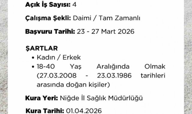 Daimi ve tam zamanlı olarak istihdam edilecek 4 kişi için başvurular 23-27 Mart 2026 tarihleri arasında alınacak. Kadın ve erkek adayların başvurabileceği ilan için 18-40 yaş şartı aranırken, kura çekimi 1 Nisan 2026 tarihinde Niğde İl Sağlık Müdürlüğü'nde gerçekleştirilecek.
