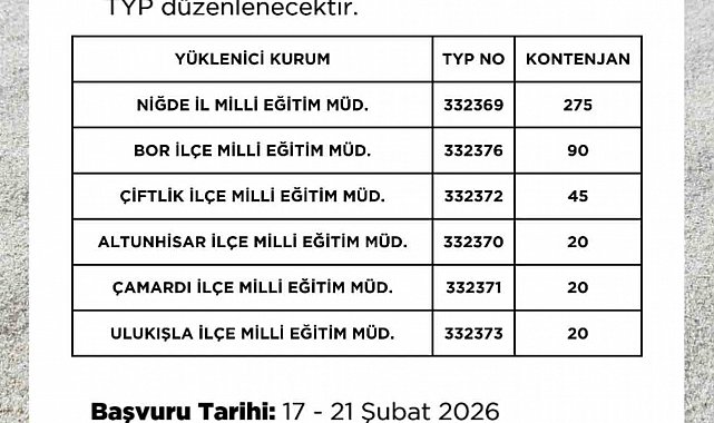 Niğde İŞKUR İl Müdürlüğü tarafından yapılan açıklamaya göre program çerçevesinde Niğde İl Milli Eğitim Müdürlüğü için 275, Bor İlçe Milli Eğitim Müdürlüğü için 90, Çiftlik İlçe Milli Eğitim Müdürlüğü için 45, Altunhisar, Çamardı ve Ulukışla İlçe Milli Eğitim Müdürlükleri için ise ayrı ayrı 20'şer kontenjan ayrıldı. Böylece kent genelinde toplam 470 kişilik istihdam sağlanacak. Başvurular 17 - 21 Şubat 2026 tarihleri arasında alınacak. Program kapsamında işe başlayacak katılımcılar 2 Mart 2026 tarihinde görevlerine başlayacak ve 26 Haziran 2026 tarihine kadar okullarda görev yapacak.