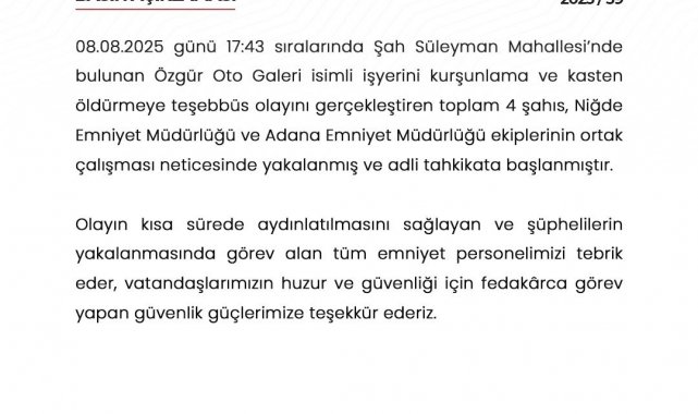 Niğde Valiliği, olayın kısa sürede aydınlatılmasını sağlayan ve şüphelilerin yakalanmasında görev alan emniyet personeline teşekkür etti.