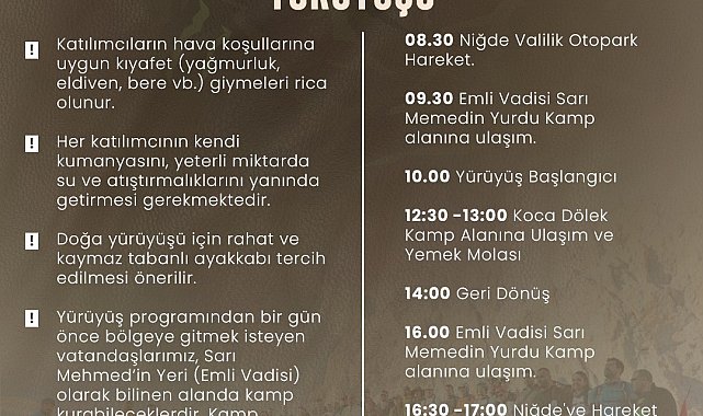 Öğle molasının Koca Dölek Kamp Alanı'nda verileceği etkinlik, 14.00'te dönüş yolculuğuyla devam edecek. Saat 18.00'de Niğde'ye varılmasıyla sona erecek doğa yürüyüşüne katılmak isteyen vatandaşların, uygun kıyafet ve gerekli ekipmanları yanlarında bulundurmaları gerektiği belirtildi. Ayrıca etkinliğe toplu taşıma imkânı sağlanacağı, 0388 232 34 21 iletişim numarası üzerinden kayıt yaptırılabileceği ifade edildi.