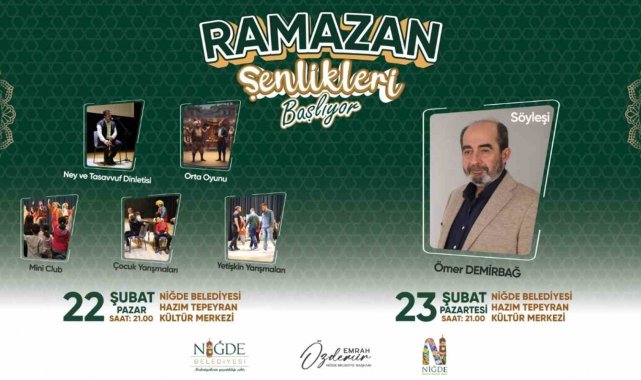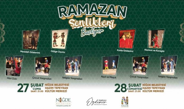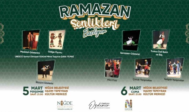 Niğde Belediyesi tarafından hazırlanan program kapsamında, paylaşma ve dayanışma kültürünü güçlendiren iftar sofraları kurulurken; çocuklardan yetişkinlere kadar her yaş grubuna hitap eden etkinlikler de Ramazan akşamlarına renk katacak. Niğde Belediye Başkanı Emrah Özdemir; Ramazan ayının birlik ve beraberlik ayı olduğuna vurgu yaparak, "Ramazan; soframızı, sevgimizi ve kardeşliğimizi paylaşma ayıdır. Bu mübarek ayın şehrimize huzur, bereket ve dayanışma getirmesini temenni ediyorum. Tüm hemşehrilerimizi iftar sofralarımıza ve düzenlediğimiz Ramazan etkinliklerimize davet ediyorum" dedi. İftar sonrası sakinleşen sokaklar, bu yıl da Niğde Belediyesi'nin düzenlediği kültürel programlarla yeniden canlanacak. Etkinliklerin adresi ise Hazım Tepeyran Kültür Merkezi olacak. Her akşam saat 21.00'de başlayacak programlar, eski Ramazanların sıcak ve samimi atmosferini Niğde'ye taşıyacak. Geleneksel Türk tiyatrosunun sevilen karakterleri, meddah ve gölge oyunları, ilahi ve tasavvuf konseri, söyleşiler ve çocuk etkinlikleriyle zengin bir takvim Niğdelilerle buluşacak. Program kapsamında; Hacivat-Karagöz gösterileri, Kavuklu Pişekar, Aşuk ile Maşuk, semazen gösterileri, kukla ve illüzyon gösterileri gibi geleneksel sanatların yanı sıra; alanında tanınmış isimlerin katılacağı söyleşiler de gerçekleştirilecek. Etkinlik takvimi ise şöyle;