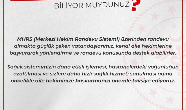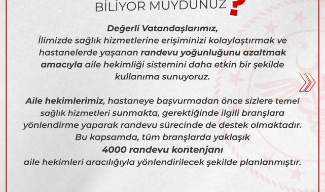 Niğde İl Sağlık Müdürlüğü tarafından yapılan açıklamada; hastanelerde yaşanan randevu yoğunluğunu azaltmak ve vatandaşların sağlık hizmetlerine erişimini kolaylaştırmak amacıyla aile hekimliği sisteminde yeni bir uygulamanın hayata geçirildiği duyuruldu. Aile hekimleri, temel sağlık hizmeti sunmanın yanı sıra gerektiğinde hastalarını ilgili branşlara yönlendirerek süreci hızlandıracak. Konuya ilişkin açıklama yapan Niğde İl Sağlık Müdürü Dr. Doğan Bahadır İnan; " Merkezi Hekim Randevu Sistemi üzerinden randevu almakta güçlük çeken vatandaşlarımız, kendi aile hekimlerine başvurarak yönlendirme ve randevu konusunda destek alabilirler. Sağlık sistemimizin daha etkili işlemesi, hastanelerdeki yoğunluğun azaltılması ve sizlere daha hızlı sağlık hizmeti sunulması adına öncelikle aile hekiminize başvurmanızı önemle tavsiye ediyoruz. İlimizde sağlık hizmetlerine erişiminizi kolaylaştırmak ve hastanelerde yaşanan randevu yoğunluğunu azaltmak amacıyla aile hekimliği sistemini daha etkin bir şekilde kullanıma sunuyoruz. Aile hekimlerimiz, hastaneye başvurmadan önce sizlere temel sağlık hizmetleri sunmakta, gerektiğinde ilgili branşlara yönlendirme yaparak randevu sürecinde de destek olmaktadır. Bu kapsamda, tüm branşlarda yaklaşık 4 bin randevu kontenjanı aile hekimleri aracılığıyla yönlendirilecek şekilde planlanmıştır" ifadelerine yer verildi.
