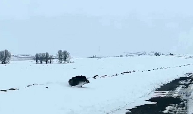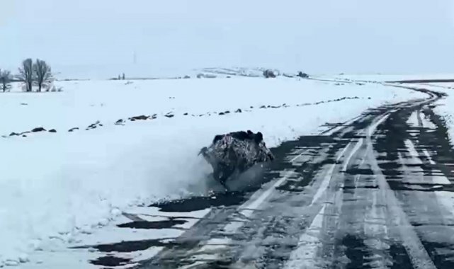 Niğde-Çamardı yolunda ilerleyen bir sürücü, karla kaplı arazide karşılaştığı yaban domuzunu cep telefonuyla kaydetti.