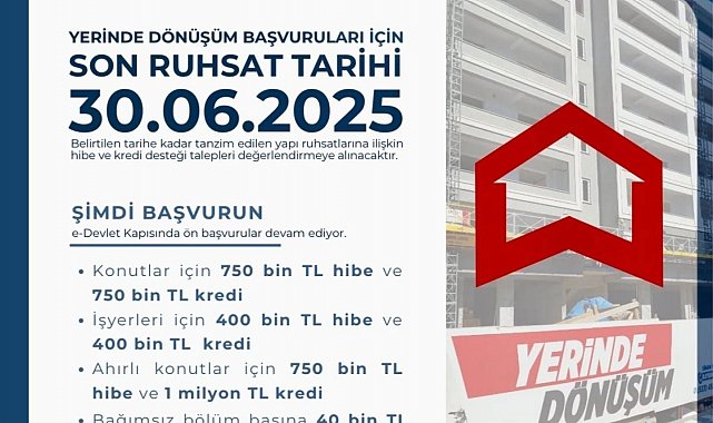 Son başvuru tarihinin 30 Haziran 2025 olduğunun hatırlatıldığı açıklamada yerinde dönüşümün ne olduğu da aktarıldı. Açıklamada; "Çevre, Şehircilik ve İklim Değişikliği Bakanlığı tarafından hayata geçirilen bu proje kapsamında, 6 Şubat 2023 Kahramanmaraş merkezli deprem sonrası ağır ve orta hasarlı olarak tespit edilen ve yıkılan binaların sahiplerine finansal destek sağlanmaktadır. Yerinde Dönüşüm Hibe ve Kredi Desteğinin amacı, konut ve iş yerlerini güvenli ve sağlam bir şekilde yeniden inşa etmek, depremzedelerin yerinde dönüşüm ile mahalle kültürünü koruyarak yaşamlarını sürdürebilmelerini sağlamak, hibe ve kredi destekleriyle mali yükü azaltmaktır" ifadelerine yer verildi. Destek tutarları ve şartlar ise konutlar için; 750.000 TL hibe, 750.000 TL faizsiz kredi olmak üzere toplam: 1.500.000 TL destek, iş yerleri için; 400.000 TL hibe, 400.000 TL faizsiz kredi olmak üzere toplam 800.000 TL destek, ahır olan konutlar için; 750.000 TL hibe, 1.000.000 TL faizsiz kredi olmak üzere toplam1.750.000 TL destek, bağımsız bölüm başına; 40.000 TL hibe olarak açıklandı. Kredilerin 2 yıl geri ödemesiz olduğunun ifade edildiği açıklamada azami 10 yıl vadeli ve faizsiz olduğu da aktarıldı.