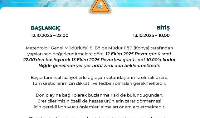 Valilikten yapılan açıklamada, 12 Ekim 2025 Pazar günü saat 22.00'den itibaren başlayarak 13 Ekim 2025 Pazartesi günü saat 10.00'a kadar Niğde genelinde yer yer hafif zirai don olayının beklendiği belirtildi. Tarım faaliyetleriyle uğraşan vatandaşların ve üreticilerin dikkatli ve tedbirli olmaları gerektiği, don olayına bağlı olarak buzlanma riskinin de bulunduğu hatırlatılarak, özellikle hassas ürünlerin zarar görmemesi için gerekli koruyucu önlemlerin alınmasının önem taşıdığı ifade edildi.