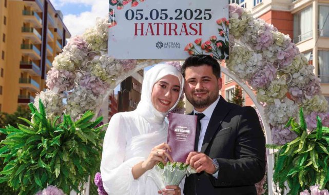 Konya'nın merkez Meram ilçesinde "05.05.2025" tarihini bir ömür boyu unutulmaz kılmak isteyen 42 çift, Meram Belediyesi Evlendirme Memurluğu'na başvurarak hayatlarını bu özel günde birleştirme kararı aldı. Sabahın erken saatlerinden itibaren Fahrünnisa Hatun Kültür Merkezi'nde bulunan Meram Belediyesi Evlendirme Memurluğu'na gelen çiftler evliliklerini bu özel günle taçlandırırken, nikah memurlarının tempolu çalışmasıyla neredeyse 11 dakikada bir çiftin nikahı kıyıldı. Meram Belediye Başkanı Mustafa Kavuş da çiftlerin aileleri ile birlikte bu özel ana tanıklık etti. Bu unutulmaz günde çiftleri yalnız bırakmayan Başkan Kavuş, bazı çiftlerin nikahını bizzat kendi kıydı ve bugün nikah kıyan tüm çiftlere de ömür boyu mutluluk diledi. Genç çiftler bugünü özellikle seçtiklerini belirterek, mutluluklarını dile getirdiler.