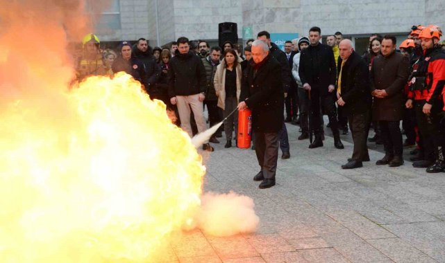 Başarılı şekilde gerçekleşen bina tahliyesinin ardından açık alanda kuru kimyevi tozla yangın söndürme tatbikatı yapıldı. Konuyla ilgili bilgilendirmenin ardından bina dışında uygulama gerçekleştirildi. Başkan Şadi Özdemir de yangın söndürme uygulaması yapanlar arasında yer aldı.