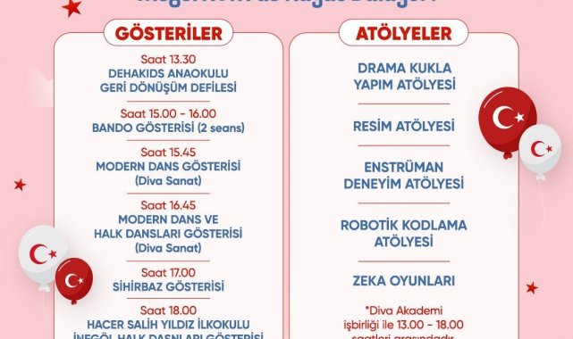 Programın devamında 17.00'de sihirbaz gösterisi ile çocuklar eğlenceli ve şaşırtıcı anlar yaşarken, gün 18.00'de gerçekleşecek halk dansları gösterisi ile coşkulu bir şekilde tamamlanacak. Etkinlik alanında ayrıca gün boyu ziyaret edilebilecek 23 Nisan Sergisi de Sanat Atölyesi'nde yer alacak.