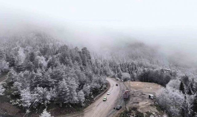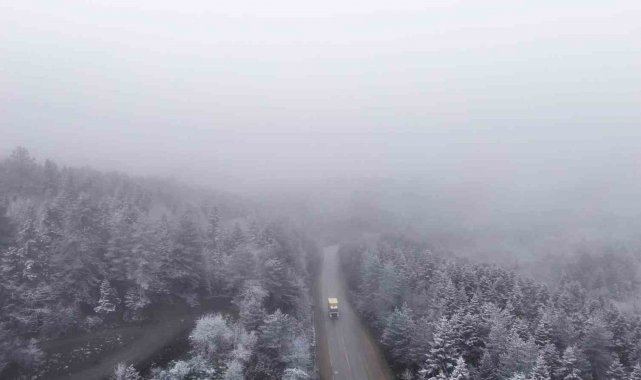 Kartpostallık kış manzaraları dron ile görüntülenirken, kar yağışını gören sürücüler de şaşkınlık yaşadı.