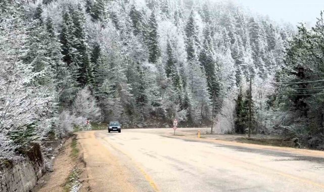 Gece saatlerinden itibaren etkili olmaya başlayan kar yağışı sonrası Karabük-Bartın kara yolunun 1030 rakımlı Ahmetusta Geçidi mevkiindeki çam ağaçları ve çiçek açan meyve ağaçlar beyaz örtüyle kaplandı.
