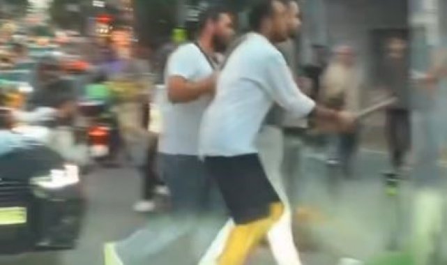 Görüntülerde, tarafların tartıştığı, sürücünün sopayla kadına yöneldiği ve bağırdığı, çevredekilerin ise müdahale ettiği anlar yer aldı. Kadının "kolumu sıktın" diyerek tepki gösterdiği ve sinir krizi geçirdiği anlar da görüntülere yansıdı. Kavga nedeniyle yolda trafik akışı bir süre durdu. Sürücünün aracına binip bölgeden ayrılmasıyla trafik normale döndü.
