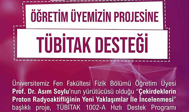 Niğde Ömer Halisdemir Üniversitesi (NÖHÜ) Fen Fakültesi Fizik Bölümü Öğretim Üyesi Prof. Dr. Asım Soylu'nun yürütücüsü olduğu 'Çekirdeklerin Proton Radyoaktifliğinin Yeni Yaklaşımlar İle İncelenmesi' başlıklı proje, TÜBİTAK 1002-A Hızlı Destek Programı kapsamında desteklenmeye hak kazandı.