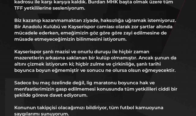 Trendyol Süper Lig'in 10. haftasında Kayserispor, deplasmanda Fatih Karagümrük ile 2-2 berabere kaldı. Maçın ardından Kayserispor Başkanı Nurettin açık alınan kulübün sosyal medya hesaplarından yaptığı açıklamada, "Karagümrük maçında verilmeyen golümüzden; aleyhimize çalınan, lehimize çalınmayan ve verilemeyen kırmızı kartlardan tutun; tüm kararları aleyhimize verme isteği içerisinde bulunan bir hakem kadrosu ile karşı karşıya kaldık. Buradan MHK başta olmak üzere tüm TFF yetkililerine sesleniyorum. Biz kazanıp kazanmamaktan ziyade, haksızlığa uğramak istemiyoruz. Bir Anadolu kulübü ve Kayserispor camiası olarak zor şartlar altında mücadele ederken, emeğimizin göz göre göre zayi edilmesine de müsaade etmeyeceğimizin bilinmesini istiyorum. Kayserispor şanlı mazisi ve onurlu duruşu ile hiçbir zaman mazeretlerin arkasına saklanan bir kulüp olmamıştır. Ancak şunun da altını çizmek istiyorum ki; hiçbir zulme ve çirkinliğe, şanlı tarihi boyunca boyun eğmemiştir ve sonucu ne olursa olsun eğmeyecektir. Sadece bu maç özelinde değil, lig maratonu boyunca hak ve menfaatlerimizin gasp edilmemesi konusunda tüm yetkilileri ciddi bir şekilde göreve davet ediyorum. Konunun takipçisi olacağımızı bildiriyor, tüm futbol kamuoyuna saygılarımı sunuyorum" diye konuştu.