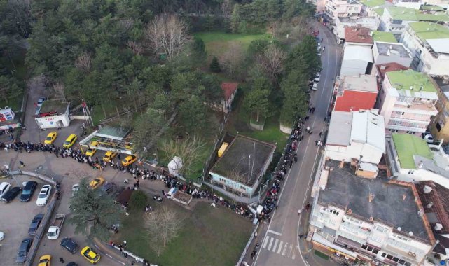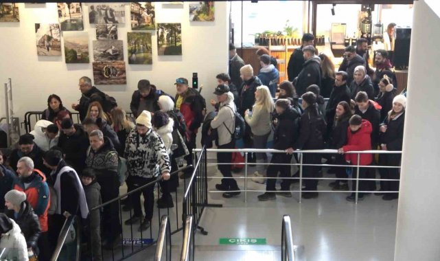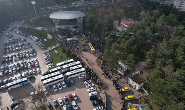 Yaklaşık 1 kilometreyi bulan kuyrukta teleferiğe binmek için bekleyenler, dron ile havadan da görüntülendi.
