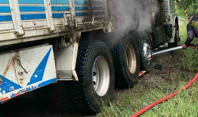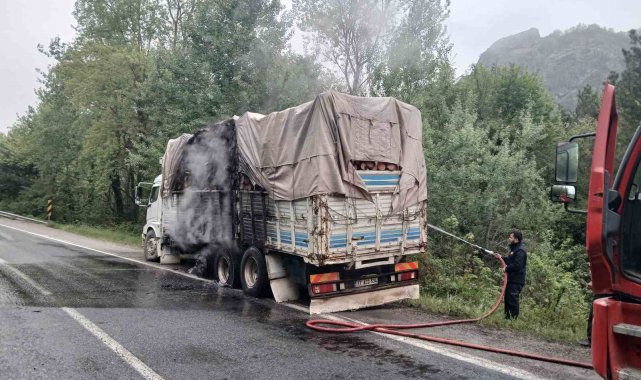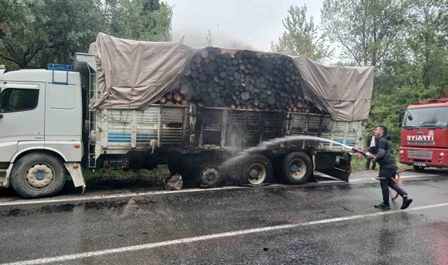Karabük'ün Yenice ilçesinde seyir halindeyken alev alan odun yüklü kamyonda çıkan yangın itfaiye ekiplerince büyümeden söndürüldü.