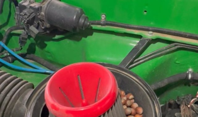 Gümüşhane Off-Road Kulübü (GÜMOFF) üyelerine ait park halindeki bir off-road aracının hava filtresine giren sincap 1 kiloya yakın fındığı burada depoladı.