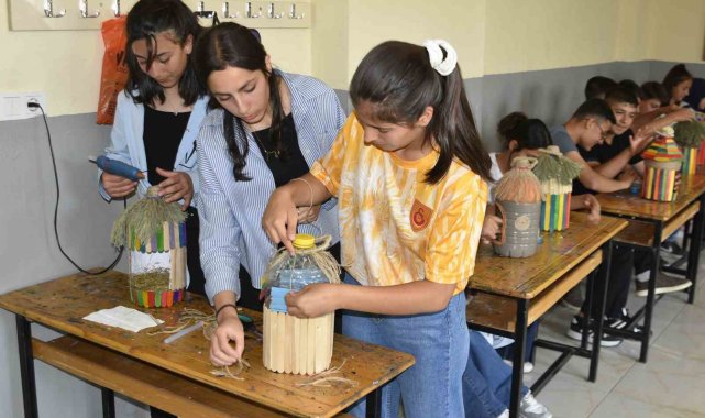 Bitlis merkezdeki 8 Ağustos Ortaokulu öğrencileri, geri dönüşümün önemini vurgulamak ve çevre bilincini artırmak amacıyla atık su bidonlarını kuş yuvasına dönüştürdü.