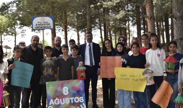 Yaklaşık bir hafta içinde yaptıkları 20 kadar renkli ve sevimli yuvalar, Bitlis Mevlana Millet Bahçesi'ndeki ağaçlara asıldı. Din Kültürü ve Ahlak Bilgisi dersinde gördükleri konudan etkilenen öğrenciler Cumhurbaşkanı Recep Tayyip Erdoğan'ın eşi Emnie Erdoğan'ın himayelerinde yürütülen 'Sıfır Atık Projesi'ne atıf yaparak topladıkları atık malzemelerden kuş yuvaları yaptı. Yuvaları okullarında yapıp, boyayan öğrenciler Bitlis-Mevlana Millet Bahçesindeki ağaçlara astı. Bitlis Belediye Başkanı Nesrullah Tanğlay'ın da katıldığı etkinlikte öğrenciler tarafından yapılan yaklaşık 30 kuş yuvası park içerisindeki ağaçlara asıldı. Öğrencilerle tek tek sohbet eden Bitlis Belediye Başkanı Nesrullah Tanğlay, "8 Ağustos Ortaokulu öğrencileri Emine Erdoğan hanımefendinin himayelerinde yürüyen 'Sıfır Atık' projesi kapsamında çok güzel bir proje yapmışlar. Geri dönüşüm malzemelerinden bizim millet bahçemize kuş yuvaları yapmışlar. Birbirinden kıymetli ve birbirinden güzel kuş yuvaları yapmışlar. Bu konuda hem gençlerimize teşekkür ediyoruz, hem de bu desteği öğrencilere veren öğretmenlerimize teşekkür ediyorum. İnşallah bunun devamını da getireceğiz. 'Sıfır Atık' projesine destek veren tüm biz de aynı desteği vereceğiz."