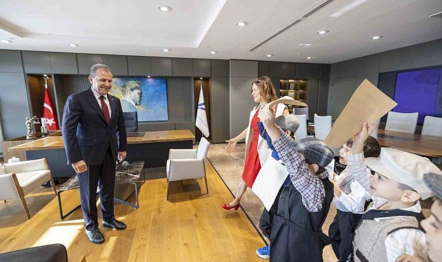 Cumhuriyetin 102'nci yılı kutlamaları kapsamında Dr. Kamil Tarhan İlkokulu öğrencileri Türkiye Belediyeler Birliği (TBB) Başkan Vekili ve Mersin Büyükşehir Belediye Başkanı Vahap Seçer'i ziyaret etti. Öğrenciler, hem renkli hem de duygusal anlara sahne olan buluşmada, kendi hazırladıkları 'cumhuriyet ilan edildi' temalı gazetelerini Başkan Seçer'e sundu.