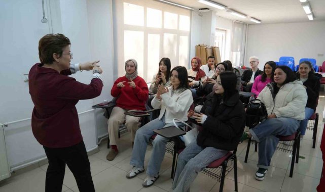 İşaret Dili Öğretmeni Pınar Sunalcan tarafından verilen eğitimlerde öğrenciler, işitme engelli bireylerle sağlıklı iletişim kurabilmek için temel işaret dilini öğreniyor. Pınar Sunalcan, işaret dili eğitimlerinin amacının hem farkındalık oluşturmak hem de işitme engelli bireylere destek olacak bilinçli öğrenciler yetiştirmek olduğunu belirterek, "Üniversitedeki öğrencilerimize işaretleri öğreterek işitme engelli bireylerimize destek sağlamayı amaçlıyoruz. Öğrenecekleri işaretlerle birçok işitme engellinin konuşan ellerimizle dili olacağız, onların hayatına dokunacağız. Bu sosyal sorumluluk projesinde hep birlikte ilerleyerek işitme engellilerimizin her daim yanında olacağız" ifadelerini kullandı.