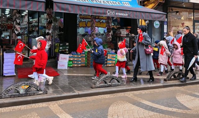 Kastamonu İl Milli Eğitim Müdürlüğü gözetiminde anaokulunda eğitim gören anasınıfı öğrencileri, öğretmenleri nezaretinde çarşı esnafını ziyaret etti. Ellerindeki Türk bayraklarını esnafa hediye eden minikler, bayrak sevgisini küçük yaşta yaşatmanın örneğini sergiledi. Esnaflar, kendilerine verilen bayrakları üç kez öpüp başlarına götürdükten sonra iş yerlerine asarken, bazı esnaflar da öğrencilere çeşitli hediyeler verdi. Ellerinde bayraklarla yürüyen öğrencileri gören vatandaşlar ise alkışlarla destek verdi.
