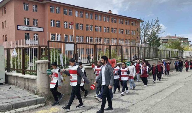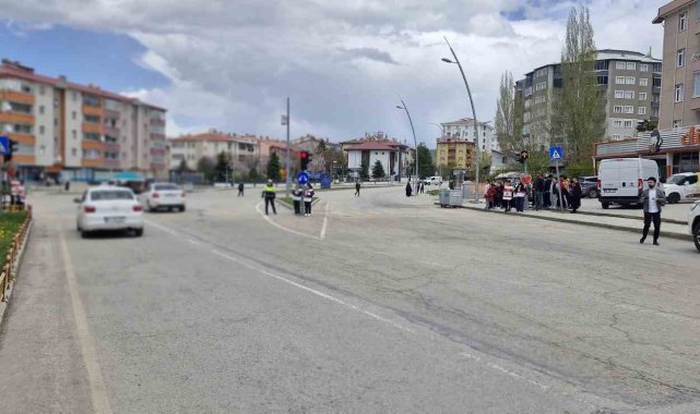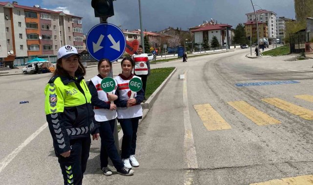 Erzurum'da ortaokul öğrencileri yaya geçidi uygulamasında sürücülere kurallara uymaları yönünde çağrıda bulundu.