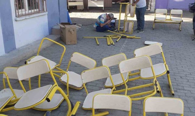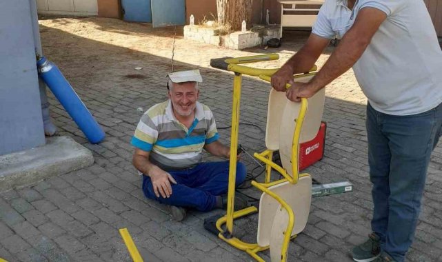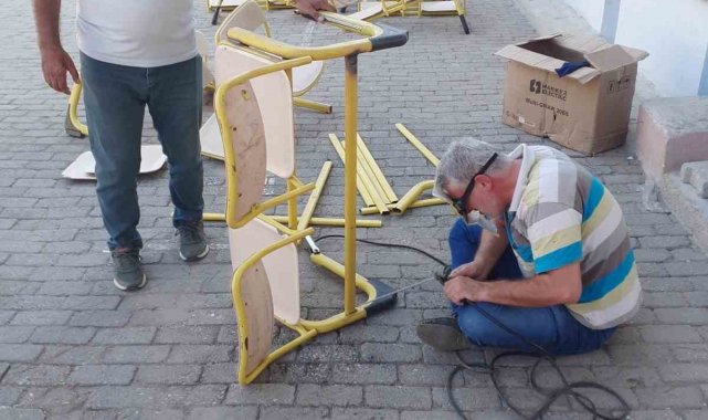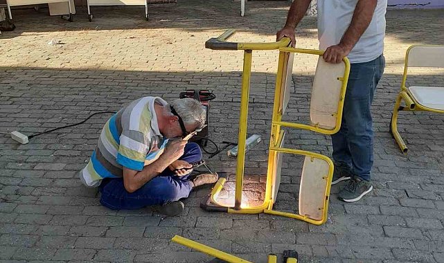 Aydın'ın İncirliova ilçesindeki Acarlar İmam Hatip Ortaokulu Müdürü Mustafa Abanoz, yeni eğitim öğretim yılı öncesinde öğrencilerinin daha iyi şartlarda ders görebilmesi için kolları sıvayarak okuldaki sıraları bakım ve onarımdan geçirerek kaynak yaptı.