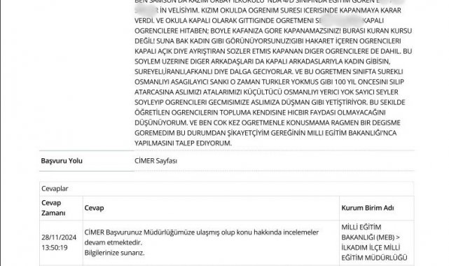 Elif Özdemir Söyler, 28 Ekim 2024 tarihli şikayet dilekçesinde, "Kızım okulda öğrenim süresi içinde kapanmaya karar verdi. Okula başörtülü gittiğinde öğretmeni S.Y., 'Böyle kafanıza göre kapanamazsınız! Burası Kur'an kursu değil! Şuna bak kadın gibi görünüyorsunuz!' şeklinde ifadeler kullandı. Diğer öğrenciler de bu sözlerden etkilenerek, başörtülü arkadaşlarına 'kadın gibisin', 'Suriyeli', 'Afganlı' gibi söylemlerle alay etmeye başladı" iddiasında bulundu.