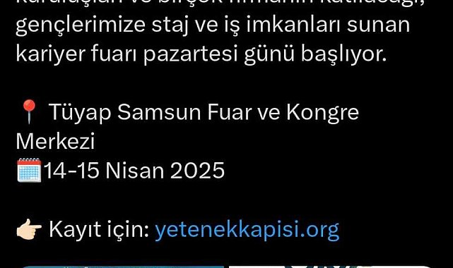 Samsun Valiliği sosyal medya hesaplarından yapılan paylaşımda, "'Yetenek Her Yerde' sloganıyla Orta Karadeniz Kariyer Fuarı Samsun'umuzda. Sektör temsilcileri, kamu kurum ve kuruluşları ve birçok firmanın katılacağı, gençlerimize staj ve iş imkanları sunan kariyer fuarı pazartesi günü başlıyor" ifadelerine yer verildi.