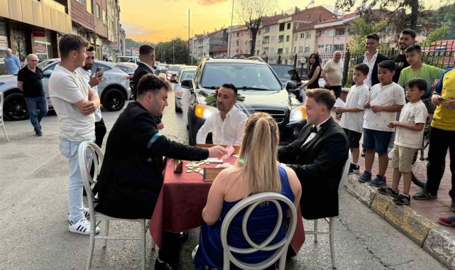 Okey masası kurarak düğün konvoyunun önünü kestiler