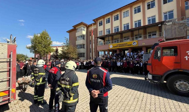 Afyonkarahisar'ın Şuhut ilçesinde itfaiye ekipleri Anadolu Lisesi'nde öğrencilerin bilinçlenmesi amacıyla yangın tatbikatı düzenledi.