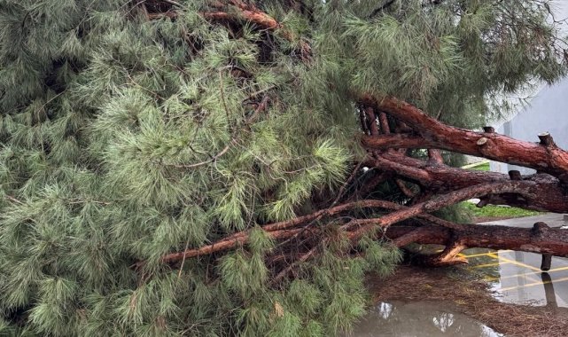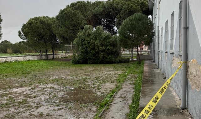 Okul bahçesindeki çam ağaçları kuvvetli rüzgara dayanamadı