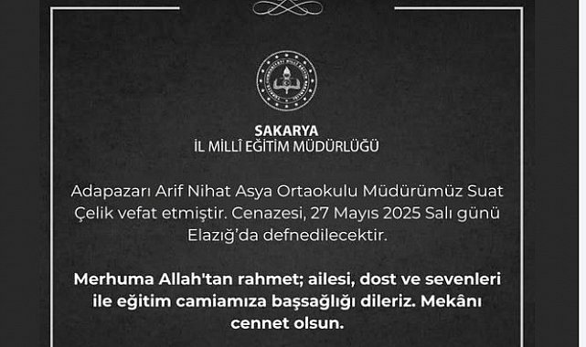 Adapazarı Arif Nihat Asya Ortaokulu Müdürü Suat Çelik, uzun süredir tedavi gördüğü kanser hastalığına yeni düşerek hayatını kaybetti. Çelik'in cenazesi yarın memleketi Elazığ'da toprağa verilecek. Sakarya İl Milli Eğitim Müdürlüğü ise hayatını kaybeden okul müdürü için sosyal medyadan baş sağlığı diledi. Paylaşımda, "Adapazarı Arif Nihat Asya Ortaokulu Müdürümüz Suat Çelik vefat etmiştir. Cenazesi 27 Mayıs Salı günü Elazığ'a defnedilecektir. Merhuma Allah'tan rahmet; ailesi, dost ve sevenleri ile eğitim camiamıza başsağlığı dileriz. Mekanı cennet olsun" ifadelerine yer verildi.