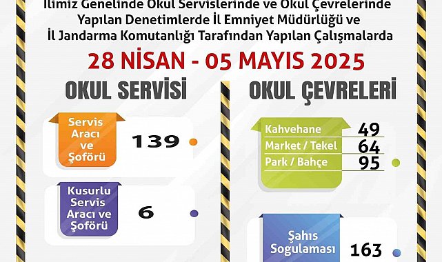 Edinilen bilgilere göre, İl Emniyet Müdürlüğü ve İl Jandarma Komutanlığı ekiplerince okul servisleri ile okul çevrelerine yönelik denetimler sürdürülüyor. Bu çerçevede, 28 Nisan - 5 Mayıs tarihleri arasında çalışma yapıldı. Ekiplerce kontrol edilen 136 servis aracından 6'sının kusurlu olduğu belirlendi. Okul çevrelerinde bulunan 49 kahvehane, 64 market ve 95 park olmak üzere 208 farklı mekan denetlendi. Ayrıca, çalışmalar sırasında 163 şahsın kimlik bilgileri sorgulandı.