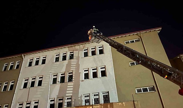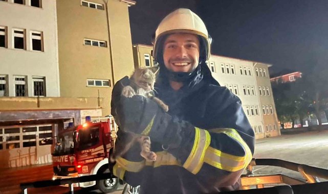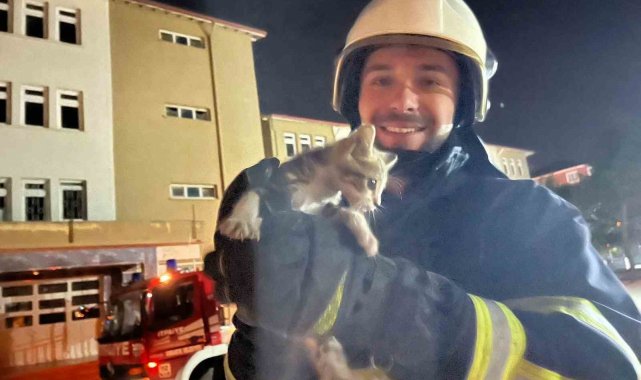 Okulun çatısında mahsur kalan yavru kedi, itfaiye ekiplerince kurtarı