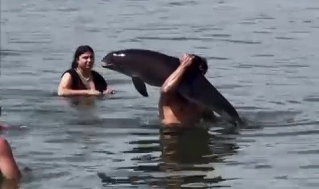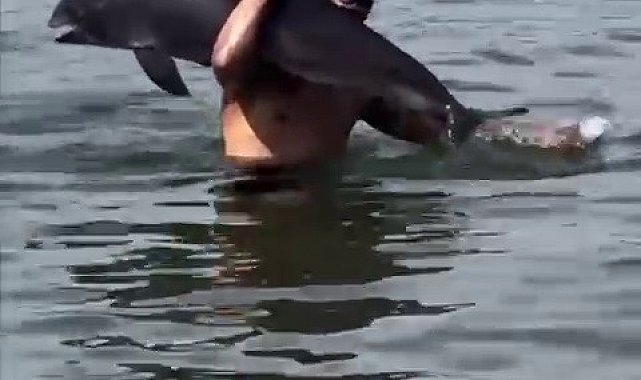 Olay, Mudanya ilçesi Güzelyalı Sahili'nde meydana geldi. Bir vatandaş, ölmüş yunus balığını sırtında taşıyarak kenara getirdi. İlginç anlar, saniye saniye amatör kamera ile kaydedildi.
