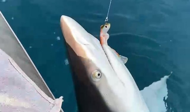 Hatay'ın Payas ilçesinde amatör balıkçılık yapan Cengiz Bayar'ın botundan denize saldığı oltaya yaklaşık 30 kiloluk köpek balığı takıldı. Köpek balığını korkarak botuna kadar yaklaştıran Bayar'ın yaşadığı heyecan dolu anlar kameraya yansıdı.
