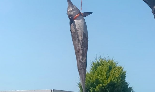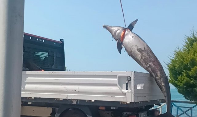 DÜZCE(İHA) – Düzce'nin Akçakoca ilçesinde sahile vuran ölü yunus balığı ekipler tarafından kaldırılarak götürüldü.