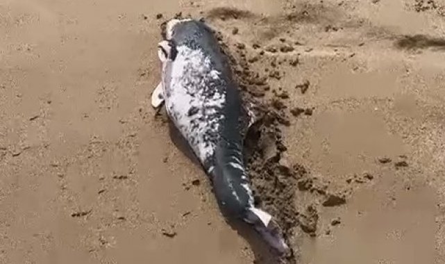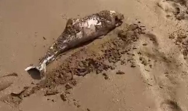 Kocaeli'nin Kandıra Sarısu Plajı'nda karaya vurmuş ölü yunus yavrusu cep telefonu kamerasıyla görüntülendi.