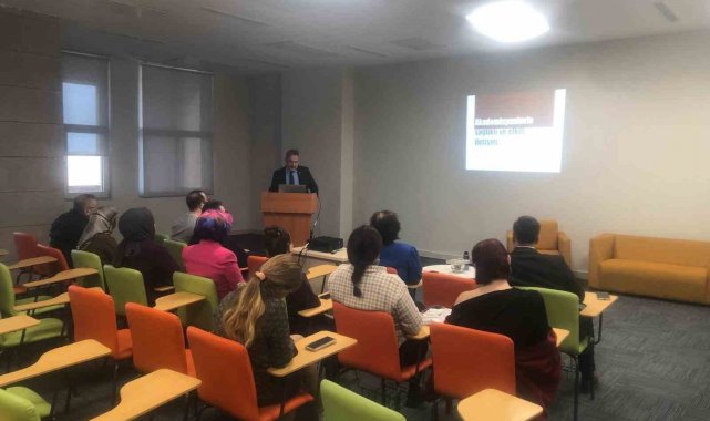 Programın devamında, 'Akademisyen ve Öğrenciyle İletişim' eğitimi, Kullanıcı Hizmetleri Akademik Danışmanı Öğr. Gör. İbrahim Ethem Olukcuoğlu tarafından gerçekleştirildi. Bu bölümde, akademisyen ve öğrenci profilleri, iletişim biçimleri ve kullanıcı karakter analizleri üzerinden kütüphane hizmetlerinin daha etkili sunulmasına yönelik yaklaşımlar paylaşıldı.