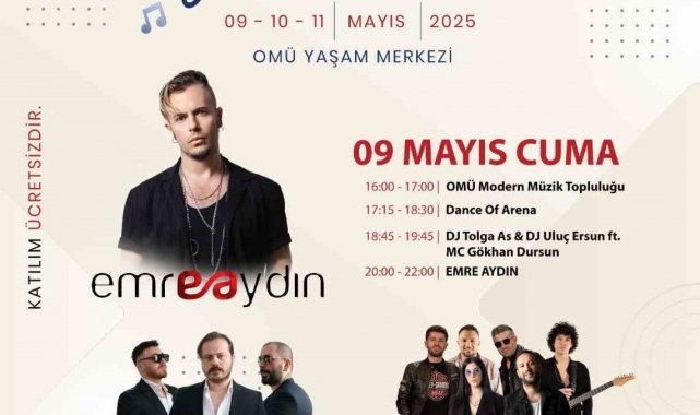 9 Mayıs Cuma günü saat 16.00'da OMÜ Modern Müzik Topluluğu'nun sahne almasıyla başlayacak şenliklerde, ardından Dance Of Arena dans gösterisi gerçekleştirilecek. Akşam saatlerinde DJ Tolga As & DJ Uluç Ersun ft. MC Gökhan Dursun performansıyla coşku artacak. Gecenin finalinde ise ünlü sanatçı Emre Aydın, OMÜ Yaşam Merkezi Meydanı'nda konser verecek.